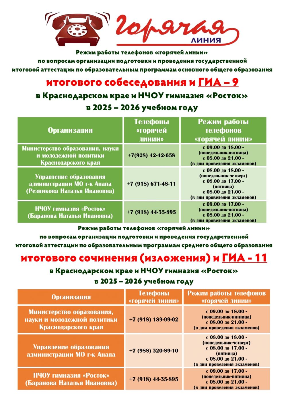 О работе телефонов «горячей линии» по вопросам организации и проведения государственной итоговой аттестации в 9-х и 11-х классах в 2025-2026 году в Министерстве образования, науки и молодёжной политики Краснодарского края, управлении образования администрации МО г-к Анапа и НЧОУ гимназии «Росток»